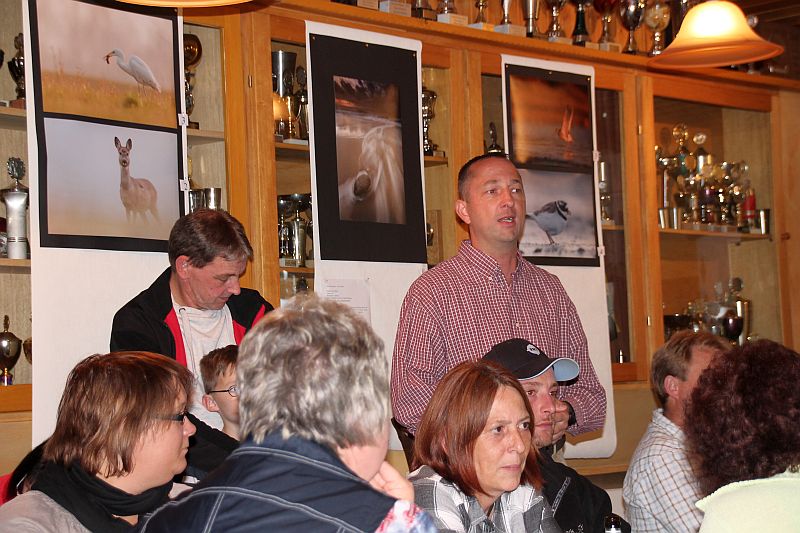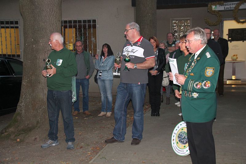 Nach dem obligatorischen Erinnerungsfoto wurde das Schießen auf den Vogel freigegeben. Unter der Leitung des Spenders (Ronald Bruckmann) wurden die Jugendlichen entsprechend eingewiesen, um den Erfolg sicherzustellen. Trotzdem gestaltete sich das erfolgreiche Treffen als schwierig, da das ungewohnte Ziel allen Probleme bereitet. Langsam wurde es dunkel und so musste die Endscheidung um die letzten beiden Körperteile verschoben werden. Man entschloss sich, die Siegerehrung mit den bis zu diesem Zeitpunkt feststehenden Siegern und dem Erringer der Ehrenscheibe vorzuziehen. Zu diesem Zweck versammelte man sich vor dem Schützenhaus, wo der 1. Vorsitzende und die beiden Jugendleiter die Auszeichnungen vornahmen. Für erfolgreiches Schießen auf den Vogel wurden mit Pokalen ausgezeichnet: