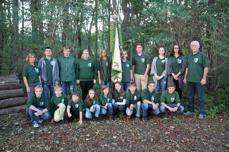 Die anwesenden Gründungsmitglieder und Jugendleiter mit Vereinsfahne