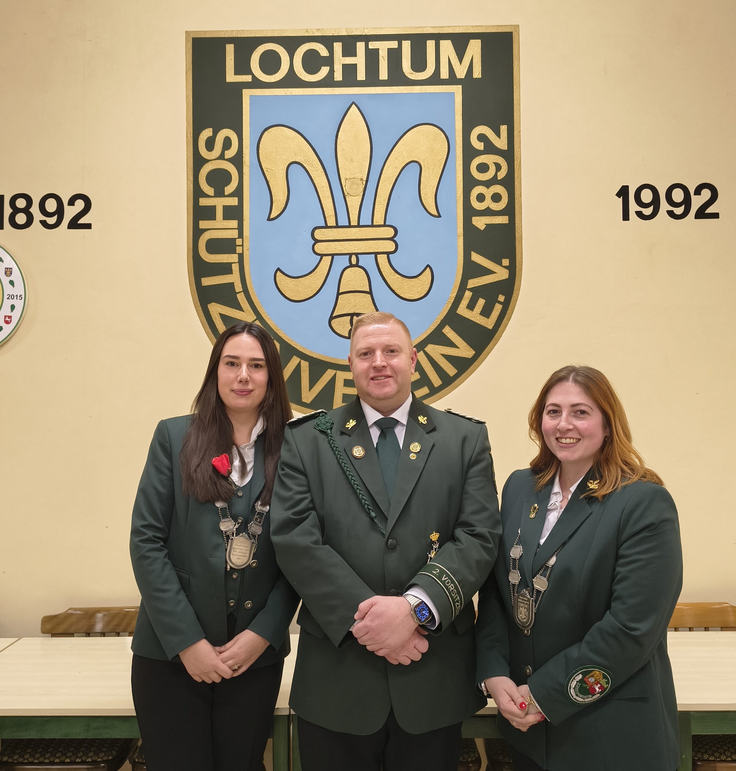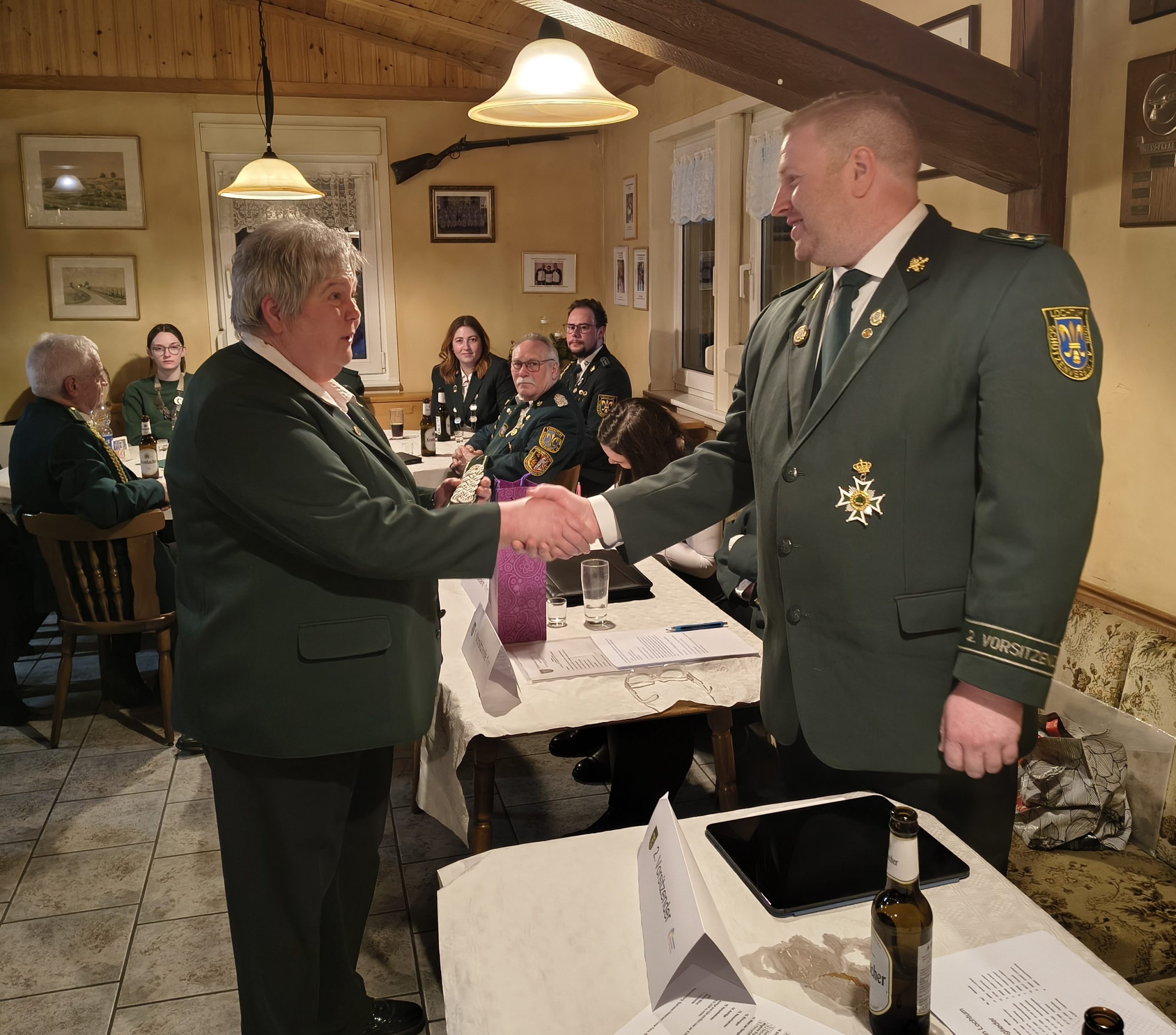 Die Übergabe der Schützenschnüre verzögerte sich etwas, da erst die erforderlichen Unterlagen beschafft werden mussten. Die Zeit wurde genutzt, um den neuen 1. Vorsitzenden entsprechend einzukleiden.
